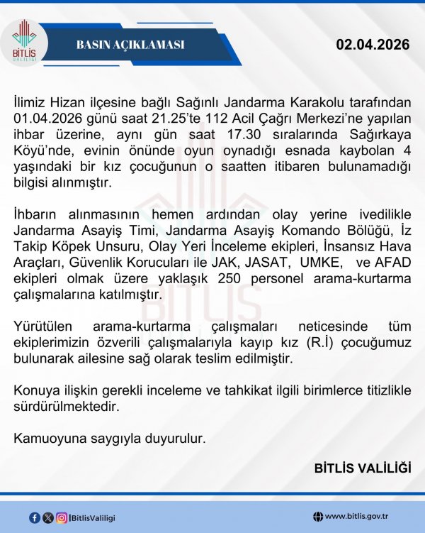 “ilimiz Hizan ilçesine bağlı Sağınlı Jandarma Karakolu tarafından 01.04.2026 günü saat 21.25'te 112 Acil Çağrı Merkezi'ne yapılan ihbar üzerine, aynı gün saat 17.30 sıralarında Sağırkaya Köyü'nde, evinin önünde oyun oynadığı esnada kaybolan 4 yaşındaki bir kız çocuğunun o saatten itibaren bulunamadığı bilgisi alınmıştır.