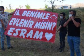 Sedat Akbay, "Benimle evlenir misin Esram" yazılı pankart açıp, genç kızı, telefonla arayıp pencereye çıkmasını istedi. Pencereye çıkan Esra Akbay ise sevinç gözyaşı döktü.